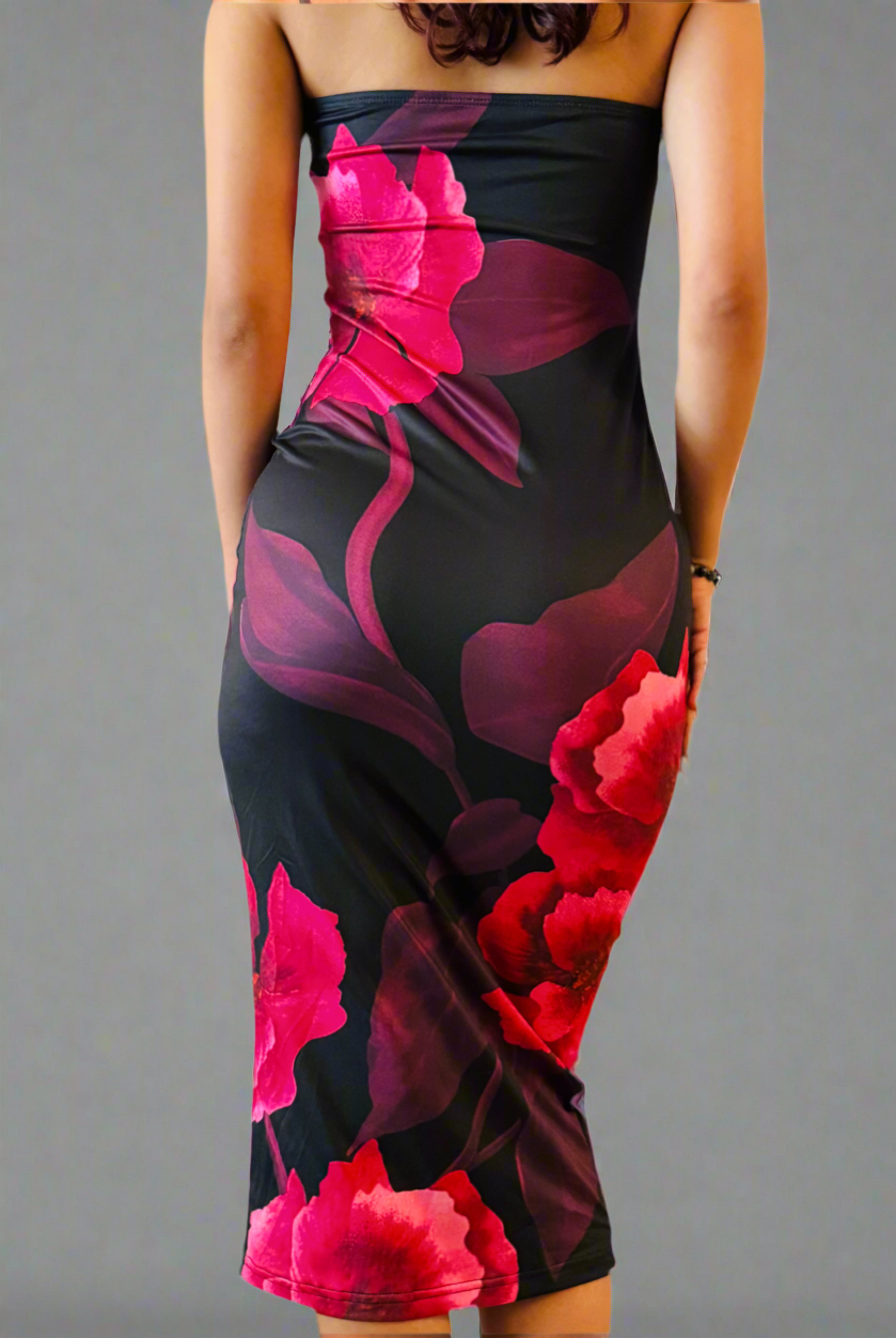 Make a statement with the Crimson Bloom dress – a stunning piece that blends elegance and drama. The striking red floral design against the deep black fabric creates a powerful contrast, perfect for date nights, special occasions, or whenever you want to turn heads. Made from a soft, stretchy fabric for a flattering, body-hugging fit.