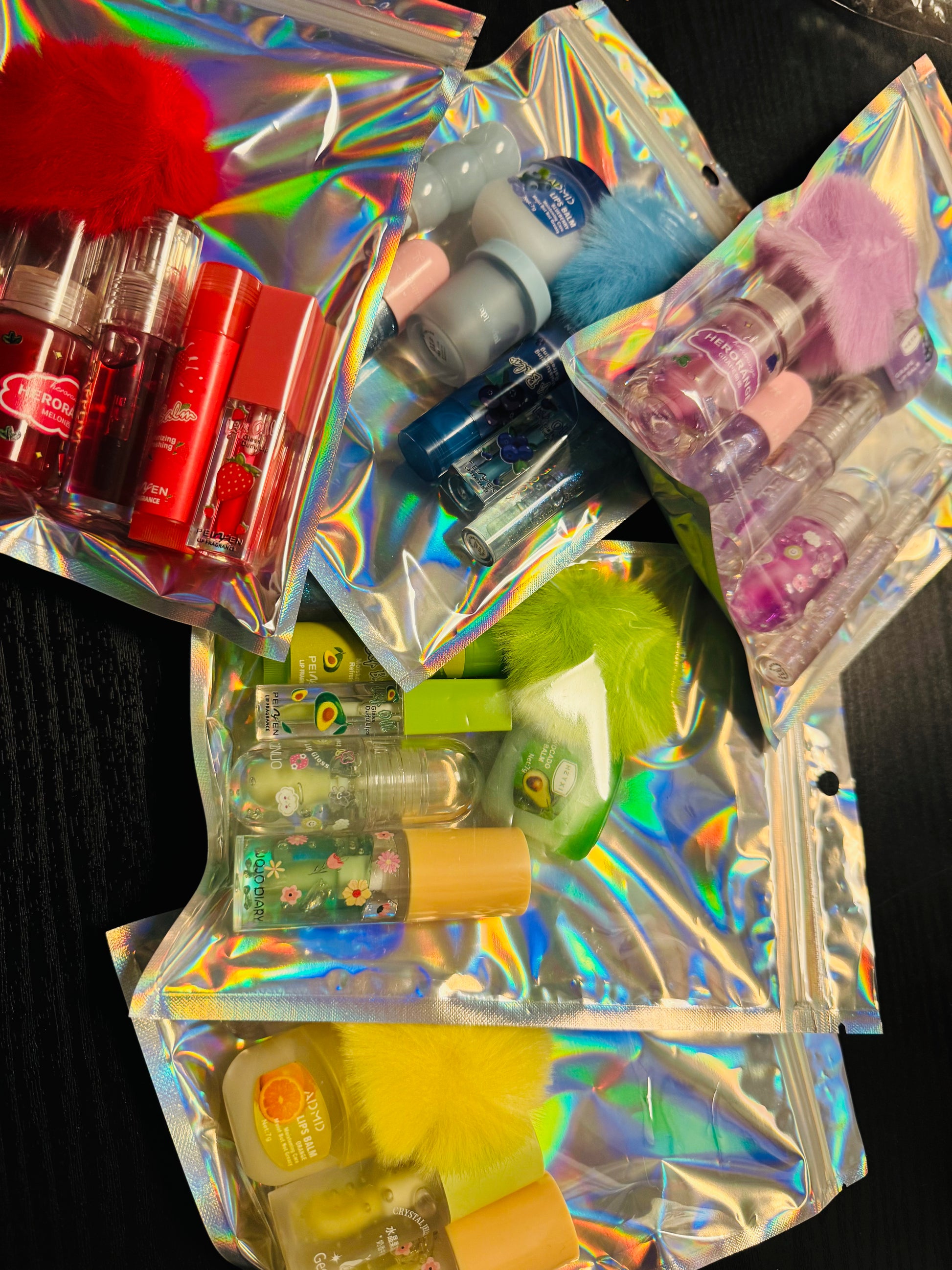 Cute & trendy Self-Care Gloss Bundles! Each holographic bag includes lip glosses , and a fluffy pom keychain — all color-matched for the perfect vibe 💕 Available in Red, Blue, Purple, Green & Yellow. Perfect for gifts, stocking up, or treating yourself. Collect every color & glow up your routine!